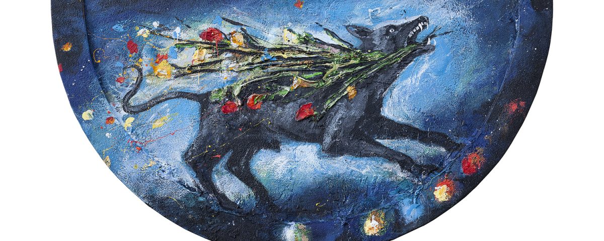 En un diálogo sostenido con la sensibilidad y discurso de Tamayo, la concepción de la pieza de Aragón Reyes alude al ámbito inmemorial de lo cósmico/astral y recupera el protagonismo, neoexpresionista y legendario, del ser animal. Hay que decir, por otro lado, que Aragón Reyes articula la visión de Tamayo al tiempo que, como el propio maestro hizo y aconsejó siempre, incorpora en la obra sus propias visiones. La forma de la sandía, fruto devorado siempre por monstruos lúdicos y homeomórficos en la pintura del metafísico de lo cotidiano que fue Rufino Tamayo, se vuelve ahora el espacio mito-poético donde el arquetipo del pintor (¿un ser dual que representa a Tamayo y a Aragón Reyes simultáneamente?) es llevado por el perro nocturno a través del reino de la pintura. La trama visual de la pieza de Aragón Reyes recuerda las fábulas del psicopompo, el animal que acompaña y transporta las almas de los muertos en la vida-después-de-la-muerte-terrenal. Es muy interesante que en el caso de esta imagen de Alberto Aragón Reyes, los iconos del perro de la noche, el pintor iniciado, las plantas-pincel y las semillas-color, se sintetizan en una representación del esplendor de la energía solar, un tema enigmático de dimensiones esotéricas que Rufino Tamayo descubrió, a su vez, en el linaje secreto que corre desde el Romanticismo, los pintores de Barbizon, Van Gogh y los Impresionistas, hasta la era de la Escuela de París y las Vanguardias el siglo XX.