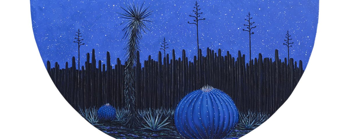 Estas cactáceas son una comunidad. Se mantienen en pie como seres en oración, erguidos y respetuosos, alzando la vista hacia el espacio infinito, una noche brillante y por cierto fresca, inmensa y salpicada de estrellas. Tanto ellas como el espectador son invitados a mirar con asombro hacia el infinito. Me viene a la mente el clásico cuento del gran escritor de ciencia ficción Arthur C. Clarke, “Los nueve mil millones de nombres de Dios”, en el que, en la última línea, la multiplicidad de estrellas se equipara con esos nombres inefables, mientras que, incomprensiblemente, comienzan a apagarse, una a una. Aquí, al parecer, las cactáceas son tan innumerables, tan inagotables como las estrellas. Conocen esos nombres, se levantan y hablan todas y muestran su pleitesía no arrodillándose sino estirándose, extendiéndose más allá en la inmensidad del universo, como si con su esfuerzo llegaran a comprender y sentir. Incluso la redonda biznaga azul, en primer plano entre los agaves, se hincha como planeta, con una magia, un misterio que sugiere –como la pistola de Tamayo– que pueden explotar. Pero no amenazan.