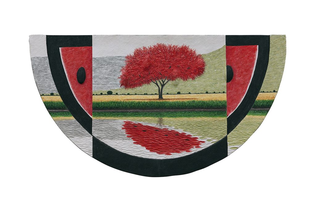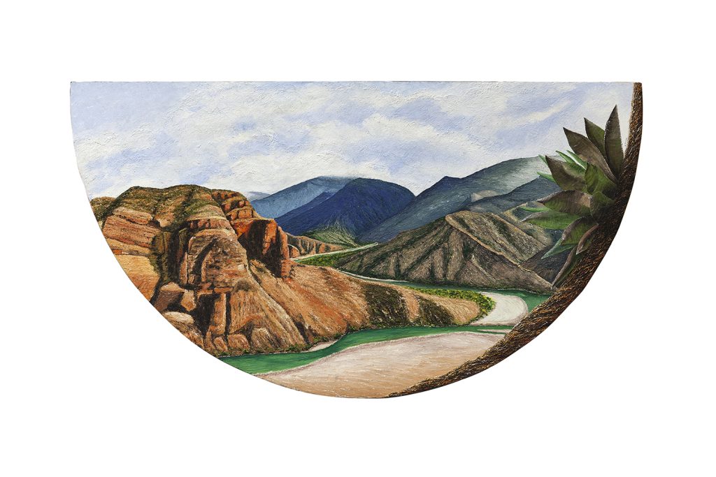 La ventana de Tamayo, fiel a su filosofía de que menos colores dan al artista más fuerza y significado, es un mundo frío de grises y blancos. El paisaje de Pons reconoce esa frialdad y ese uso restringido del color –azules en su mayoría, motas de verde grisáceo, pinceladas de brillo estelar–, pero su dramatismo proviene de la exultante proliferación del crecimiento. Hay majestuosidad en el azul de la luna de esta medianoche. Como el poste de telégrafo de Tamayo que se adentra en la noche, sosteniendo la luna, la panoplia de cactus de Pons envía flores en tallos, implorando al cielo, aplacando, suplicando.